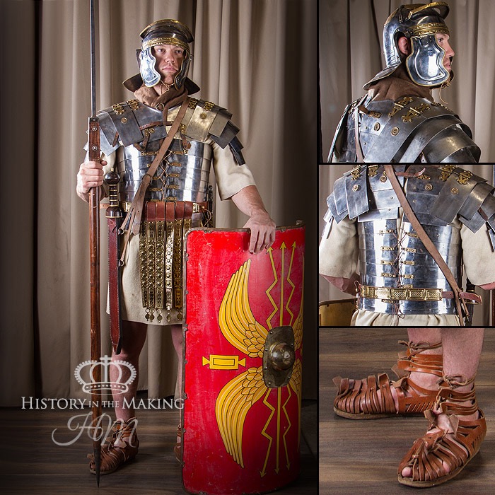 The set comprises of 1 X Helmet. 1 X full body armour. 1 X belt with brass tassels. 1 X Roman Sword and scabbard with cross belt. 1 X Roman Spear. 1 X Roman Dagger in scabbard. 1 X Roman Shield. 1 X wool neck scarf. 1 X Wool Tunic. 1 X Pair roman sandals.