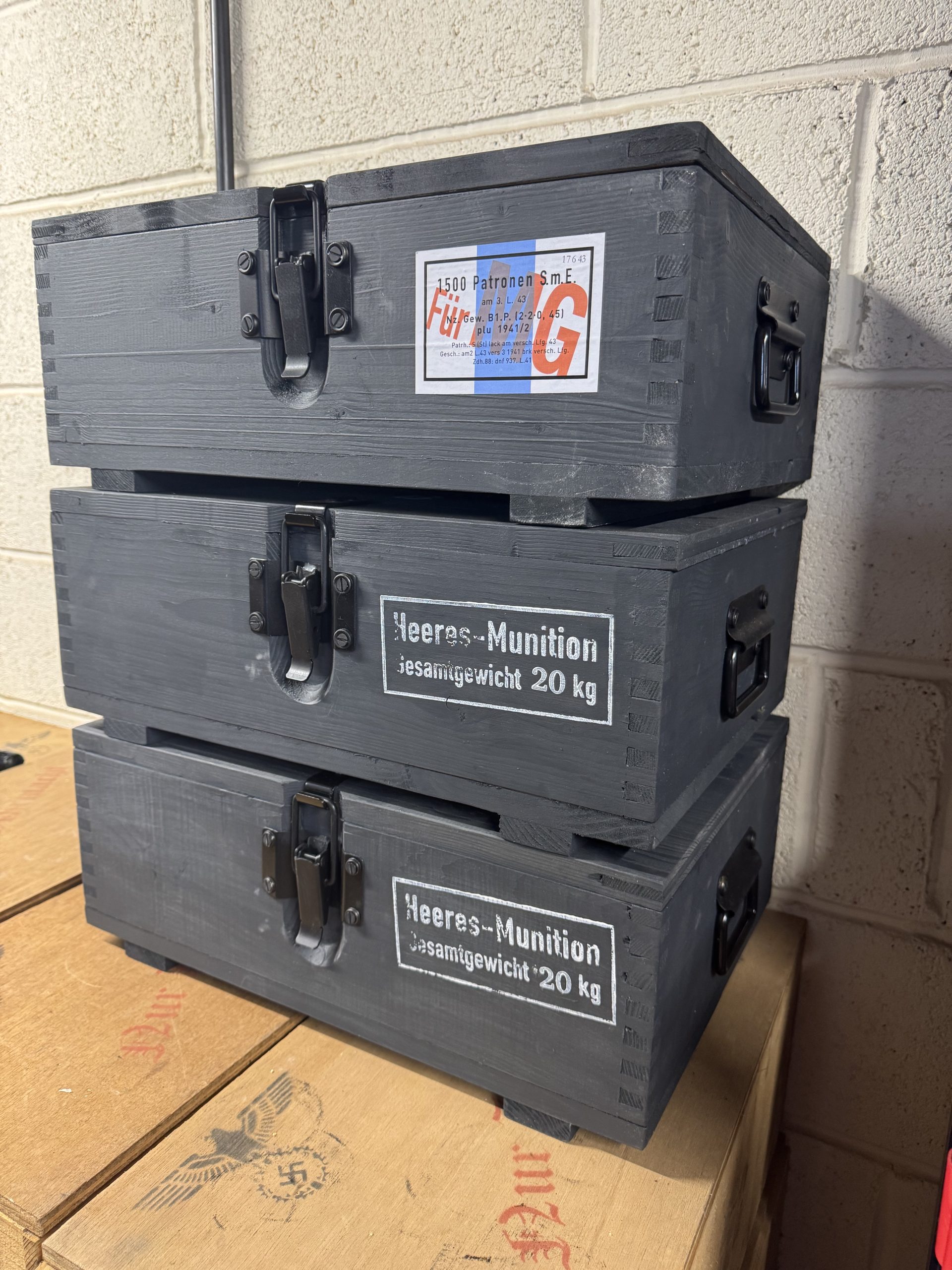 These are our reproduction German WW2 Ammunition Crates. Designed to transport 7.92 Machine Gun Ammunition from the factory to wherever they were required. Used bay all services in the German Army, Airforce and Navy during WW2.